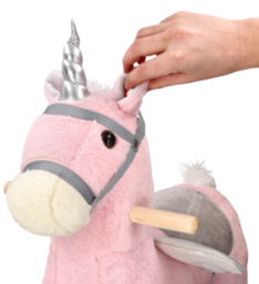 Konik wykonany z mięciutkiego pluszowego materiału w różowym kolorze. To co dodaje mu uroku i charakteru to srebrzyste dodatki m.in.: róg i skrzydełka, biały ogon, pyszczek oraz grzywa a także szare siodło i kopytka. Konik posiada drewniane płozy i uchwyty zachowane w kolorach naturalnego drewna.